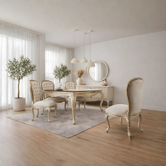 De Aurelio Grandezza Eettafel Set is een indrukwekkende combinatie van klassieke elegantie en moderne luxe. Het verfijnde ontwerp met sierlijk handgesneden details en een warme goudtint zorgt voor een exclusieve uitstraling die perfect past in een stijlvol interieur.