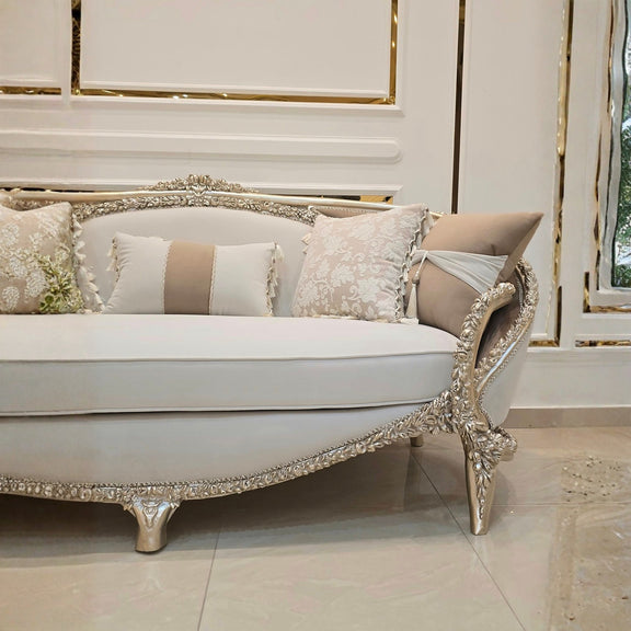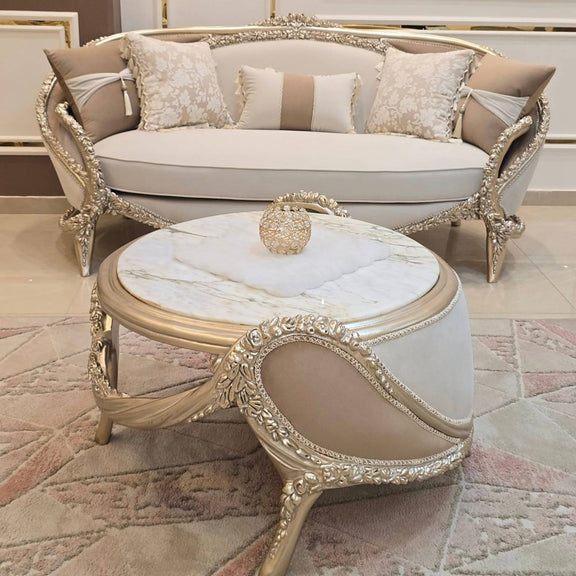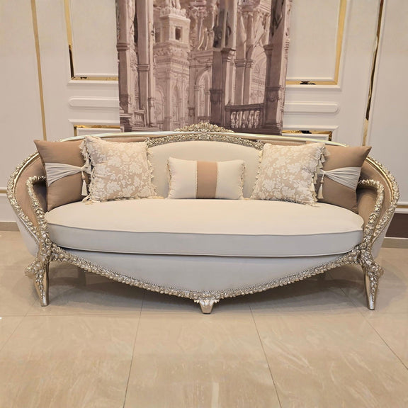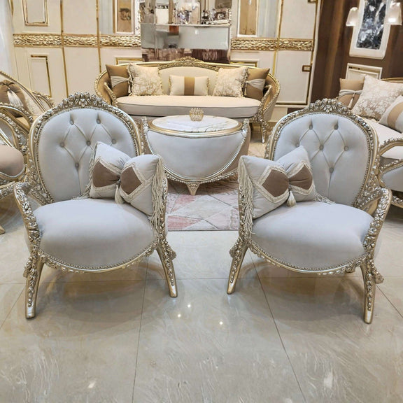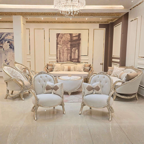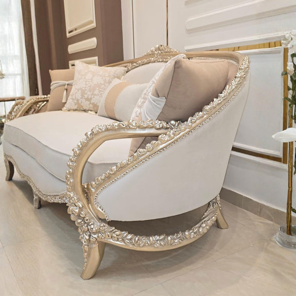 De Château Lumière salon set straalt pure verfijning uit. Met haar sierlijk gecarvde lijnen, subtiele gouden accenten en zachte crème bekleding brengt deze set een harmonieuze balans tussen klassieke grandeur en moderne rust.