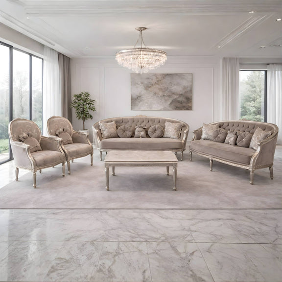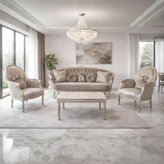 De Épison salon set is een perfecte combinatie van tijdloze charme en geraffineerde luxe. Uitgevoerd in een zachte champagnetint met grijsfluwelen bekleding, biedt deze set niet alleen comfort, maar ook een klassieke uitstraling die elke ruimte verrijkt.