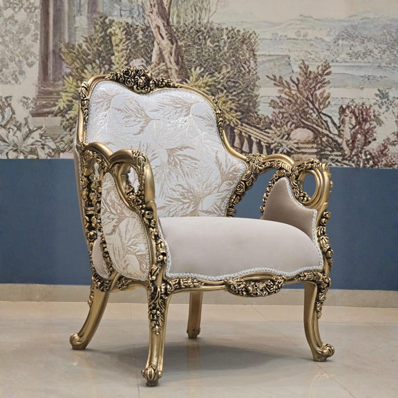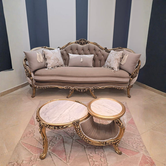 De Imperia Royale Salon Set is een toonbeeld van pure klasse en ambachtelijke perfectie. Deze exclusieve set straalt luxe uit door de rijkelijk handgesneden details, elegante goudaccenten en zachte taupe-beige stoffering.