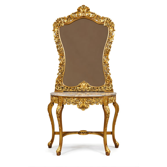 - Een bijpassende console tafel met gebogen poten en een marmeren blad, rijkelijk versierd met bloemen- en bladmotieven die zorgen voor een harmonieus en weelderig geheel.