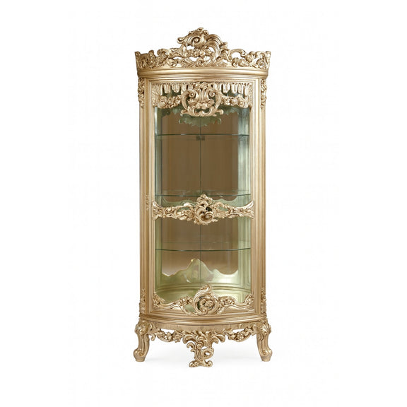 Deze vitrine straalt elegantie uit met zijn champagnekleurige afwerking en gedetailleerd snijwerk. Perfect om uw meest waardevolle items te etaleren. Verkrijgbaar in goud, crème en andere kleuren, volledig aan te passen aan uw smaak.